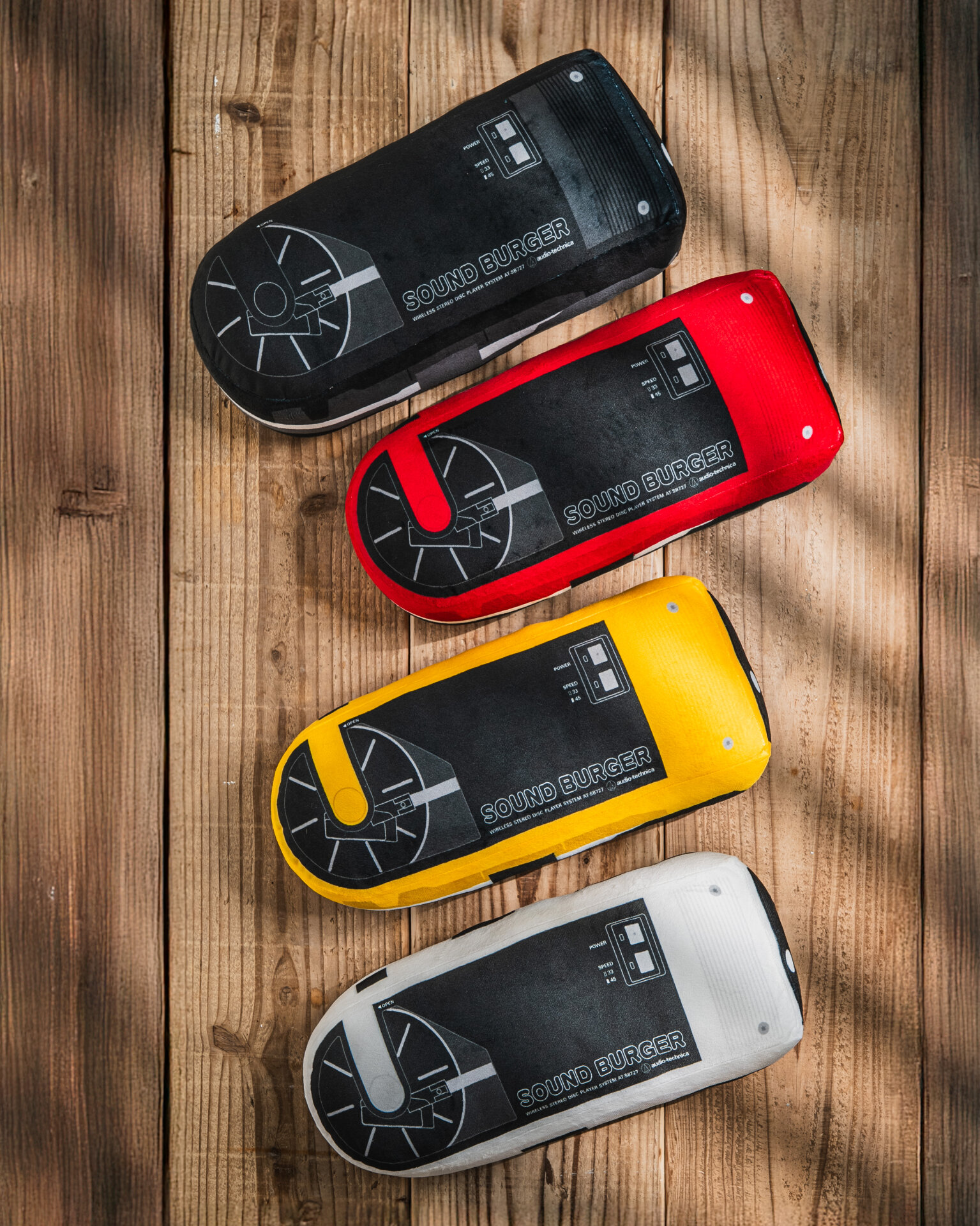 本キャンペーンでは、当社を代表するポータブルレコードプレーヤー「サウンドバーガー」をモチーフにした限定オリジナルクッション(全4色)を制作しました。11月10日から12月11日までの期間中、公式オンラインストアで8,000円(税込)以上ご購入いただいた方に、いずれか1点をプレゼントします(色はご指定いただけません)。また、本日10月20日より、SNSキャンペーンで同クッション4色セットが抽選で当たる企画を開始。さらに、11月10日からは公式オンラインストア限定製品でご利用いただける20%OFFクーポンも配布いたします。