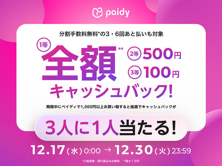 【paidy ペイディ】キャッシュバック! 12月17日(水)〜30日(火)23:59まで