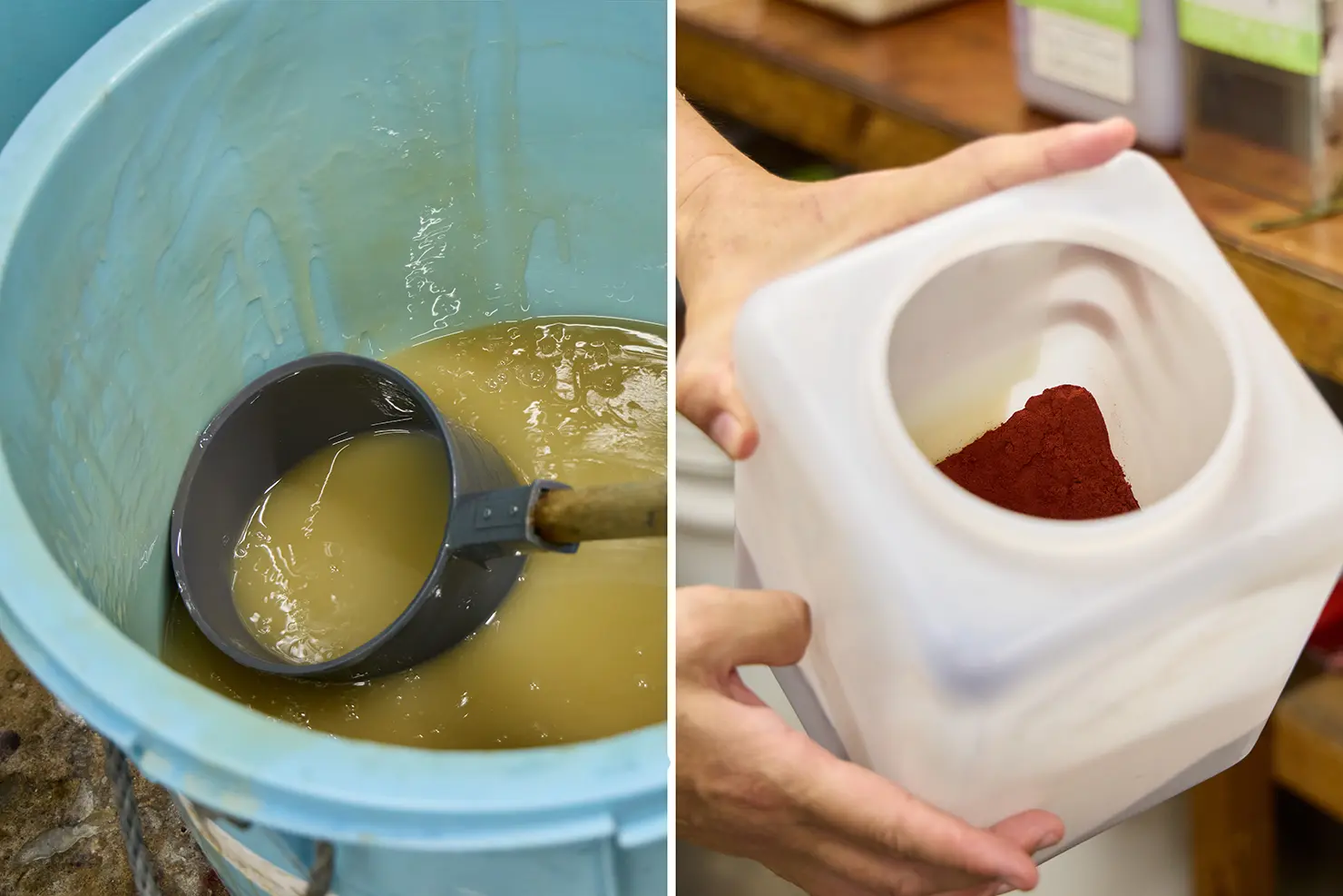 まずは、染料の調合。生地の素材やその日の気温・湿度によって、染料と一緒に生地にのせる糊のコンディションが変わるため、生地の上で狙った色を発色させるには職人の勘が必要だ。