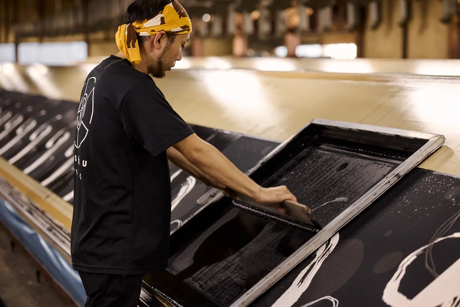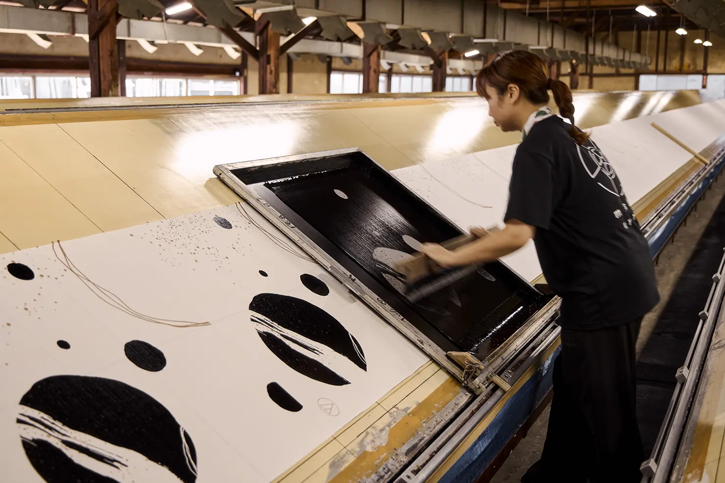 そこから始まるのが、絵柄を入れる「捺染」という作業だ。「シルクスクリーン」と呼ばれるメッシュ状の板を生地の上に置き、スキージー(へら)で染料を均等に載せる。メッシュ部分から染料が下りて生地に色が付き、柄ができる。