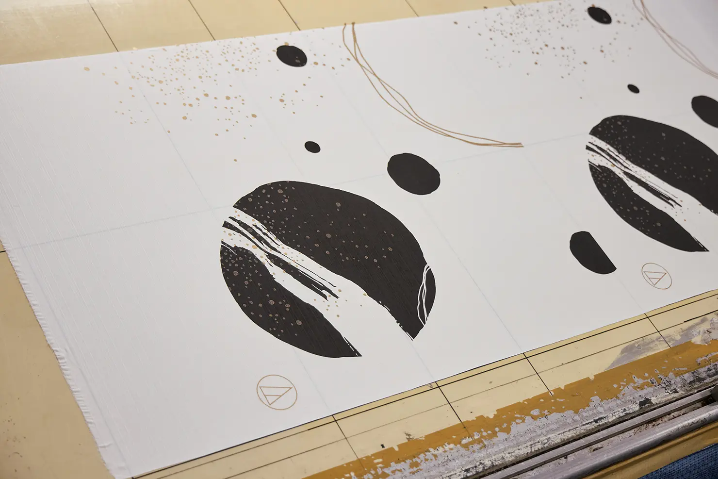 こだわったポイントは、金の分量。最初にオーディオテクニカのデザイナーから上がってきた図案では金色がふんだんに使われていたが、それを見た馬場染工場からは、分量を変えてみてはどうかという提案が出された。