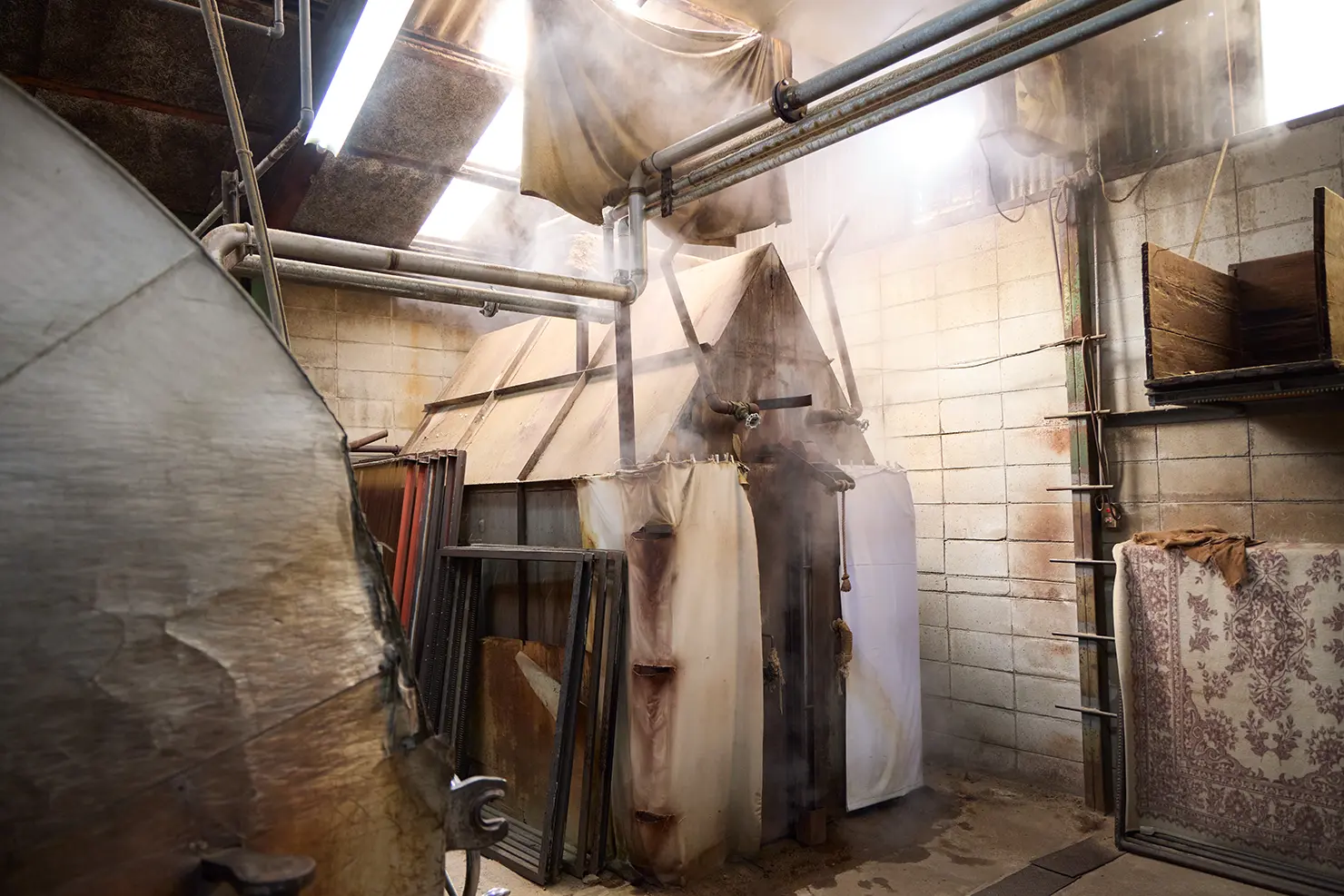 次は「蒸し工場」へ移動。ここでは生地を蒸気で蒸して染料を定着させ、水洗いで糊を落とす。その日の天気や湿度にあわせて蒸す時間は調整するので、ここでも職人による長年の経験と勘が出来上がりを大きく左右する。