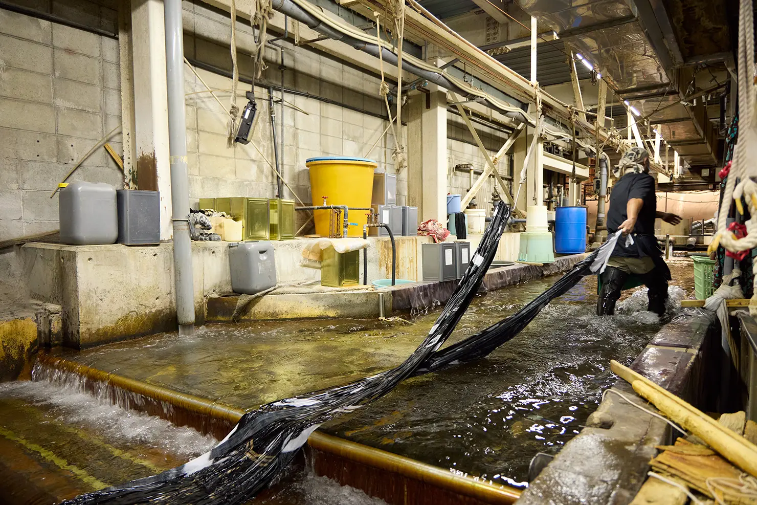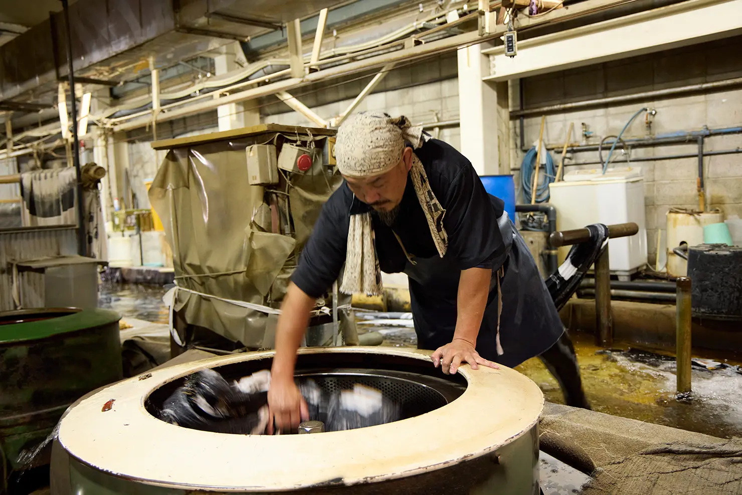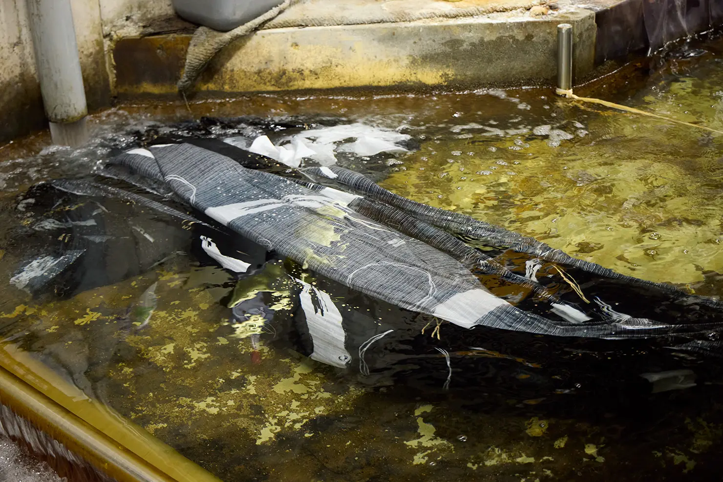 蒸し上がった生地には余分な糊や不純物が残っているので、水で丁寧に手洗いで落とす。そして脱水機にかけられ、次の職人のもとへと運ばれていく。
