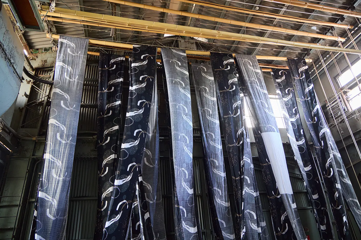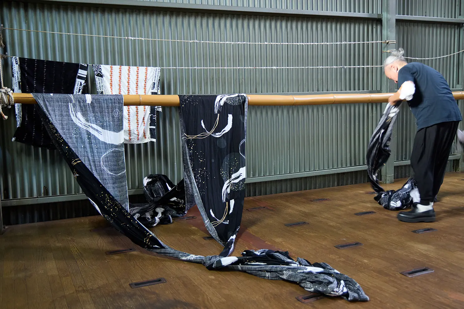 そして現在の流れは、創業当時へと回帰する動きがある。技術が発達する一方で、近年は大正2年の創業期のような技法が価値とされ、再び求められているのだ。百貨店やヨーロッパのラグジュアリーブランドにおいても、最新技術より昔ながらの染め方、つまり「日本にしかない生地を使った、日本にしかない染め方」への関心が高まっているのである。