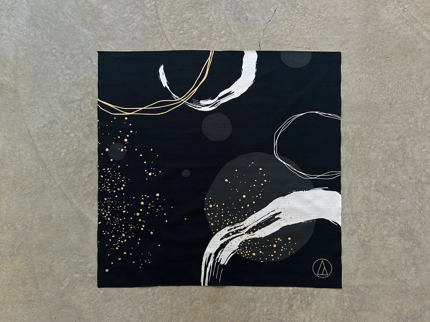 余談だが、先日一般販売を開始した全世界1,000台限定のオールインワンターンテーブル『Hotaru』にも、梱包材として馬場染工場の風呂敷が採用されている。こちらのデザインには赤や青など有彩色を使用しており、納得のいく色を完成させるまで試作を繰り返した結果、制作プロセスに約1年を要した。