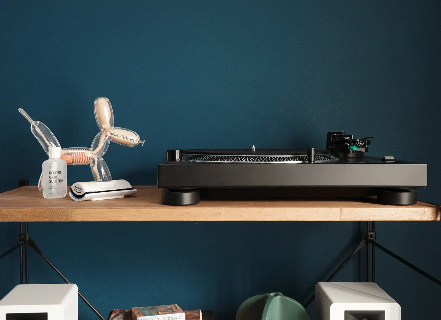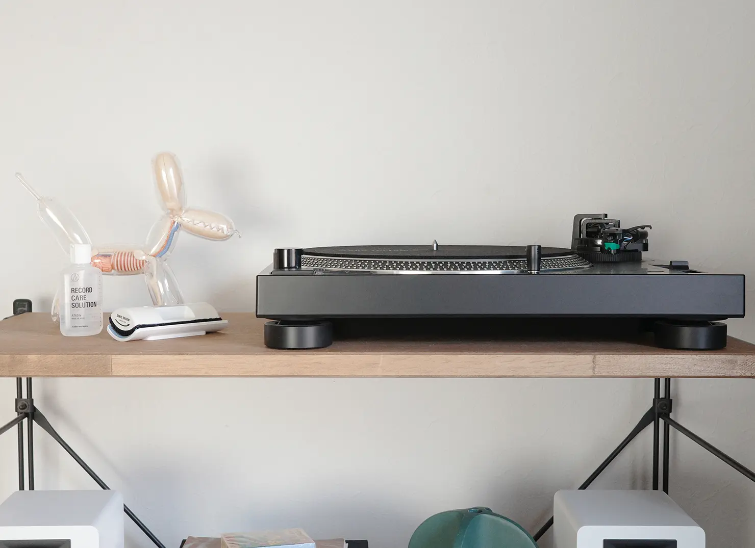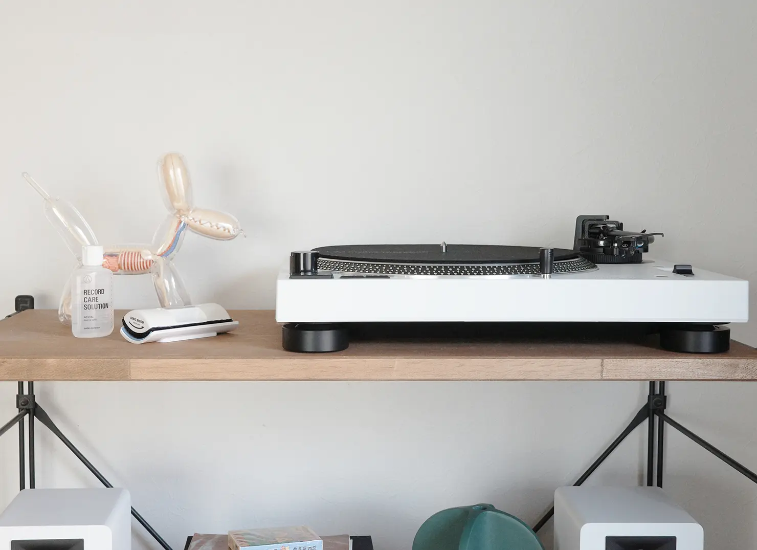 白い壁の前にホワイトのAT-LP120XBT-USBを置くと、まず感じるのは圧迫感のなさ。プレーヤーの輪郭はハッキリと見えつつも主張は控えめなので、レコードを再生していない時間でも空間を邪魔せず、棚や壁、周囲のインテリアに溶け込みます。明るい部屋、日中の自然光、植物や木製家具との相性もよいでしょう。