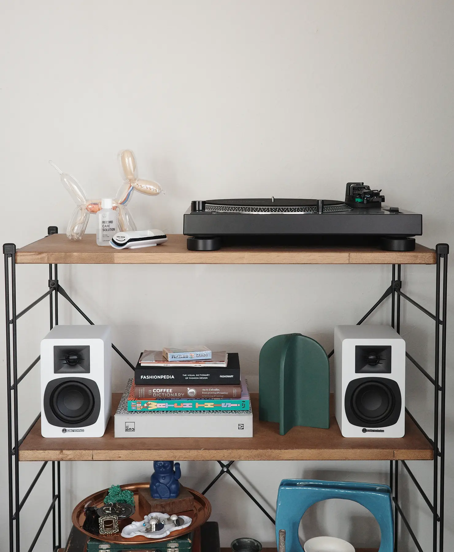 今回、下の段に置いている白いスピーカーは『AT-SP3X』。光沢や質感が近いので、色が違っていても相性は◎。黒やブラウンなどの色が濃いスピーカーが置かれると、また雰囲気が変わるでしょう。