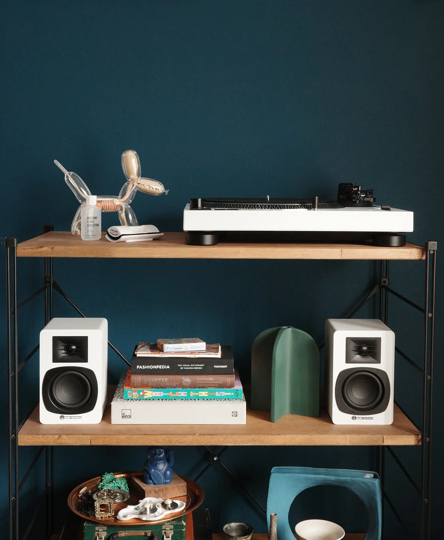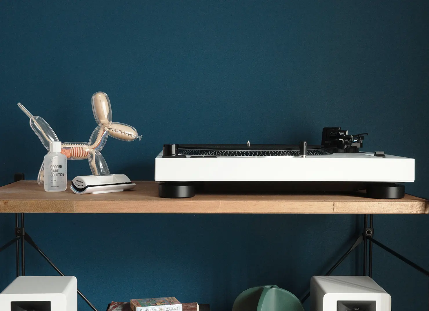 一方、青い壁にホワイトを置くと、プレーヤーは一気に「主役」になります。背景が暗い分、白い筐体が浮かび上がり、棚の上にひとつのオブジェが置かれているかのような印象です。「白い壁 × ブラック」とはまた一味違ったコントラストによって、プレーヤーの輪郭やディテールが際立ちます。