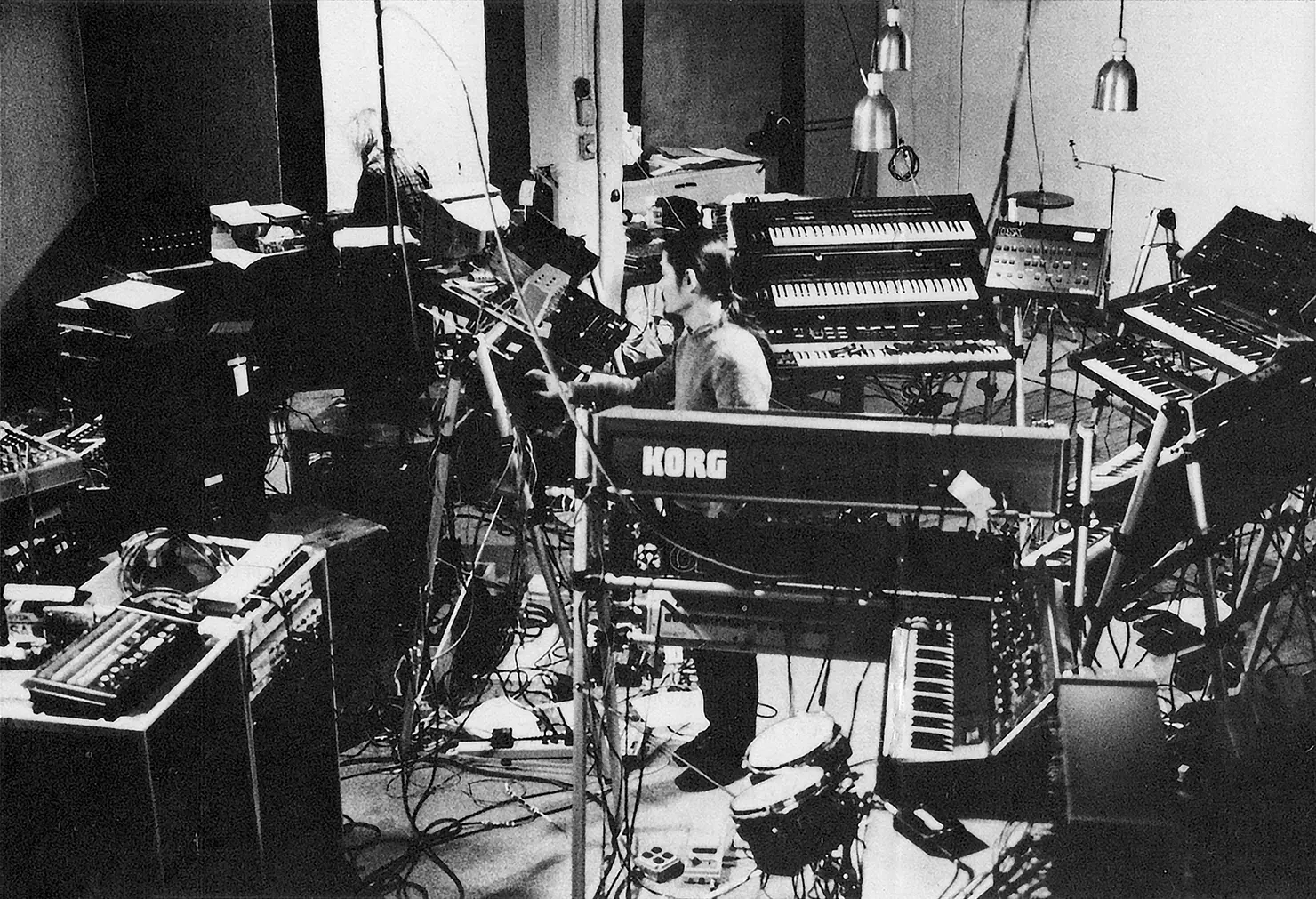 NYの制作拠点で様々なシンセサイザーに囲まれる在りし日の菊地雅章氏。(Photo by Seiichi Sugita)