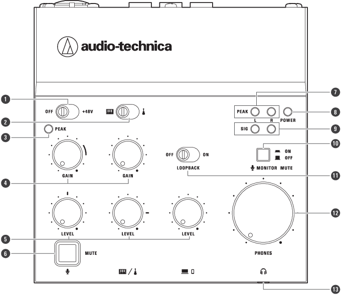 This section indicates the switches and buttons that can be set and the knobs that can be adjusted for microphone input, line input, and USB input.