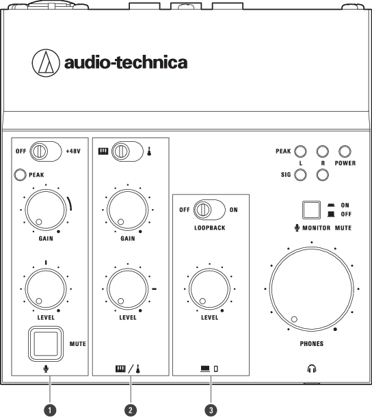 Use these parts to adjust the volume level of the computer or smartphone/tablet connected to the USB port (USB Type-C) and to turn the loopback function on/off.