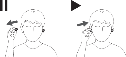 - 両方のイヤホンを耳に装着している場合、両方または片方のイヤホンを取り外すと、音楽が一時停止します。両方のイヤホンを装着すると、音楽が再開します。