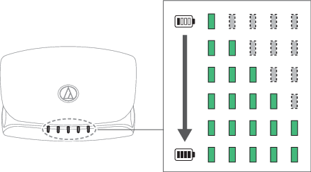 - 指示燈亮起綠燈,以指示充電盒的電池電量。充電指示燈亮起的數量表示電池電量。