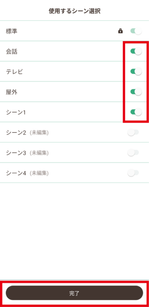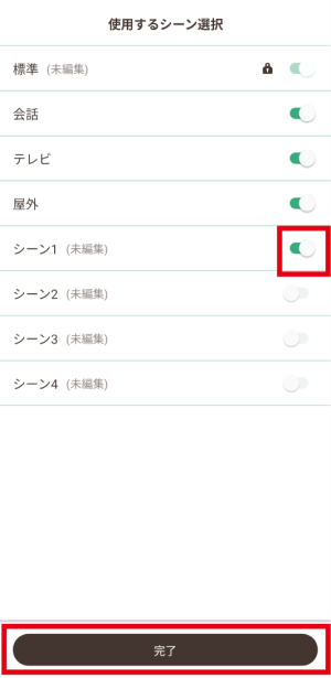 使用したいシーンを有効に切り替えます。使用しないシーンは無効に切り替えて、「完了」をタッチします。