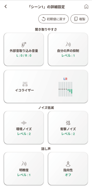機能 説明 外部音取り込み音量 このシーンの使用を開始するときの音量を設定します。L(左)、R(右)それぞれ独立して音量を設定でき、連動させる設定もできます。 自分の声の抑制 自分の声の抑制量を調整します。自分の声が大きく響いて聴こえる場合に有効です。 イコライザ― 音の高さごとに音量を調整します。音声のバランスを整えたり特定の音を抑制したりすることができます。L(左)、R(右)それぞれ独立して音量を調整できますが、連動させて調整もできます。 環境ノイズ 車や人混み、空調の音など周囲のノイズを低減します。レベルを上げると低い音などが聴き取りづらくなることがあります。 衝撃ノイズ 突発的に発生する大きなノイズを低減します。 明瞭度 人の話し声を聴き取りやすくします。レベルを上げると低い音などが聴き取りづらくなることがあります。 指向性 自分が向いている方向の音を中心に取り込みます。対面の会話などの際に便利です。