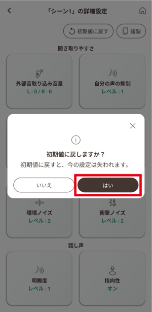「はい」をタッチするとシーン名称と各種設定項目が作成前の初期値に戻ります。