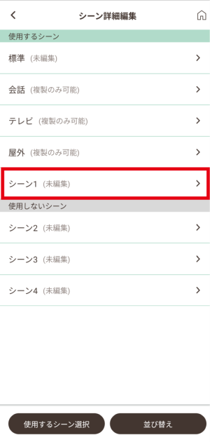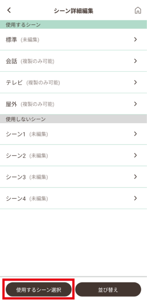 - 「使用するシーン選択」で有効にしたシーンはホーム画面での「シーンを選ぶ」画面で表示されるようになります。また、イヤホンでシーンを切り替える際、ここで有効にしたシーンが切り替わります。