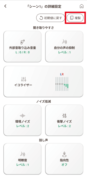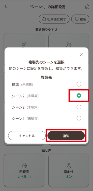 - 「会話」/「テレビ」/「屋外」は編集できません。設定を変更する場合は、「シーン1」~「シーン4」へ複製してから編集してください。