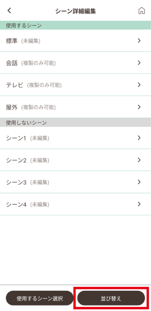 「シーン詳細編集」画面の「並び替え」をタッチします。