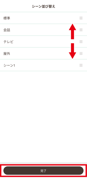 並び替えたいシーンを選び、タッチしたまま上下に移動させて順番を入れ替え、「完了」をタッチします。