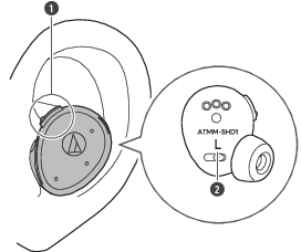 “L”の表示があるイヤホンを左耳に、“R”の表示があるイヤホンを右耳に装着します。イヤホンの操作ボタンが上側にくるように装着し、耳にフィットするかどうかを確認します。