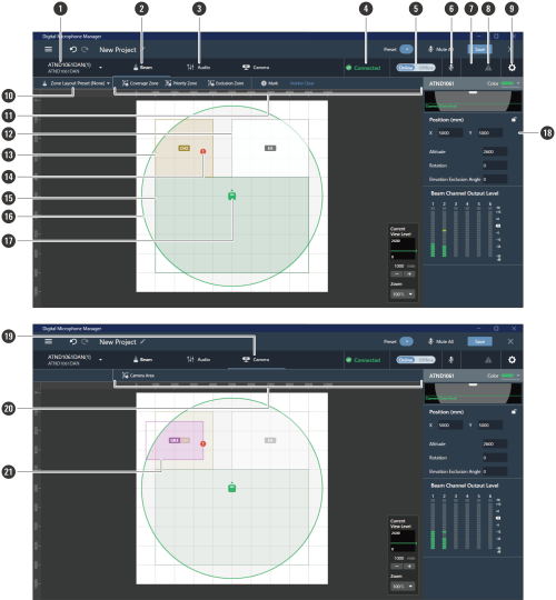 顯示麥克風可掃描聲音並拾音的區域。麥克風拾音區域的大小取決於麥克風的安裝高度以及拾音角度與視線水平的設定。