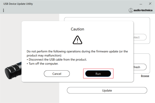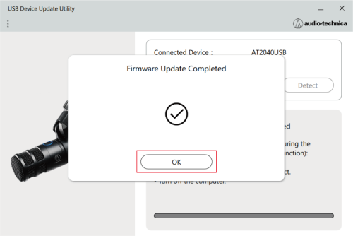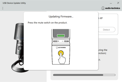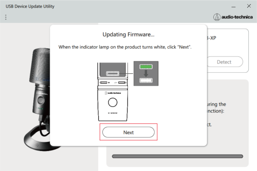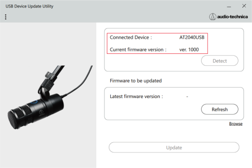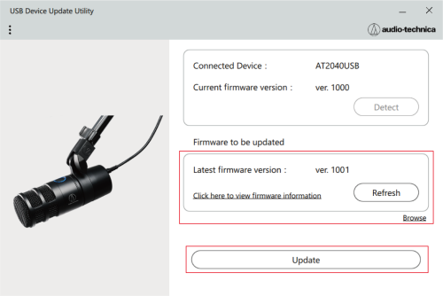 This document uses the AT2040USB as an example. Operation of the product is only required for the AT2020USB-XP. Perform the following procedure to update the firmware.