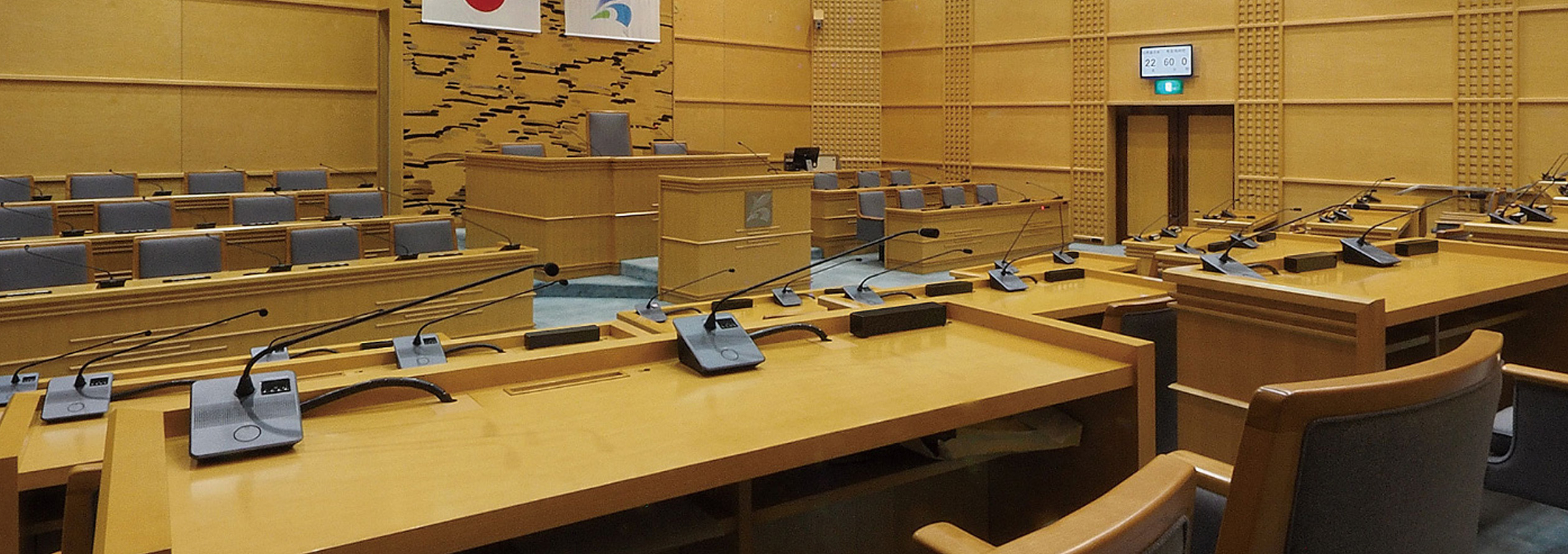 本会議場、委員会室にデジタル有線会議システムが採用されています。コントロールユニットを2台カスケード接続して運用。議会運営支援ソフトによるマイクユニットのコントロールを行なっています。支援ソフトによる発言管理を行うことでスムーズな議会運営を可能としています。