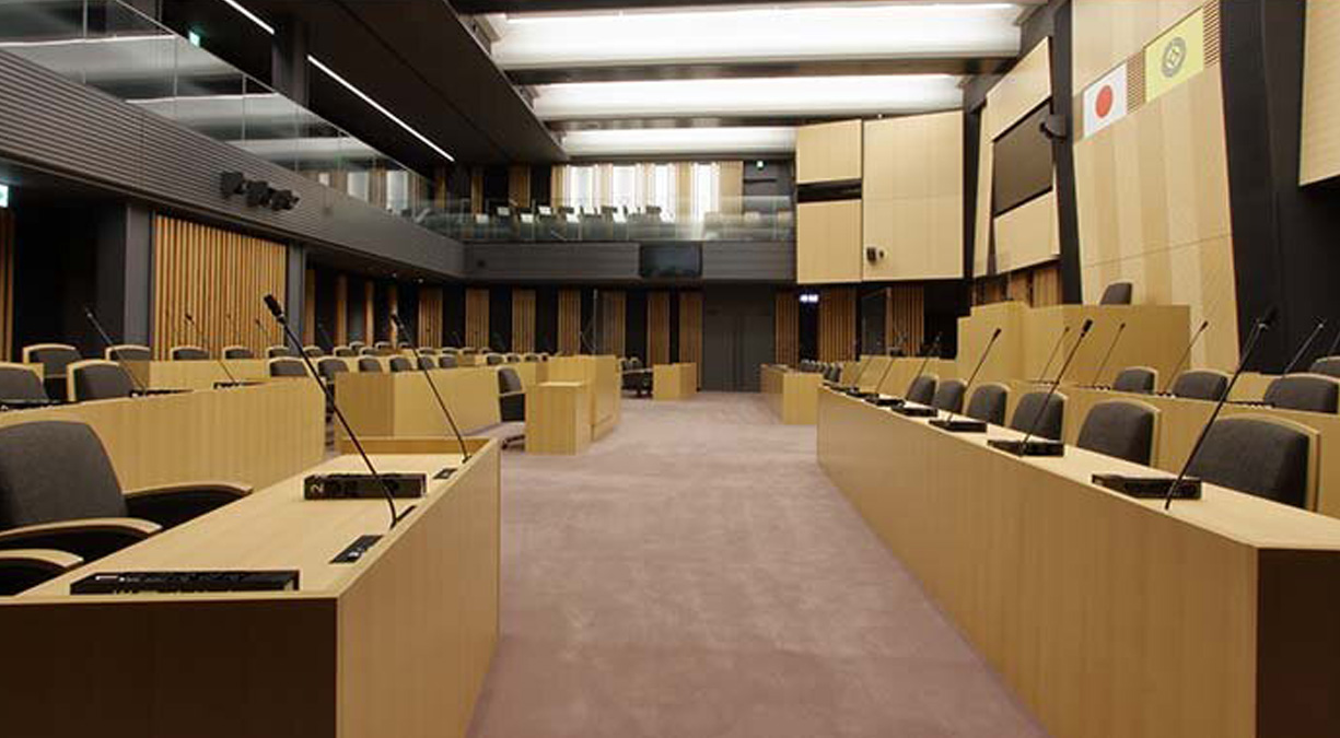 ハイブリッド赤外線会議システムにより、議場と委員会の分割・併合運用を実現し、大会議室としての運用も可能に。