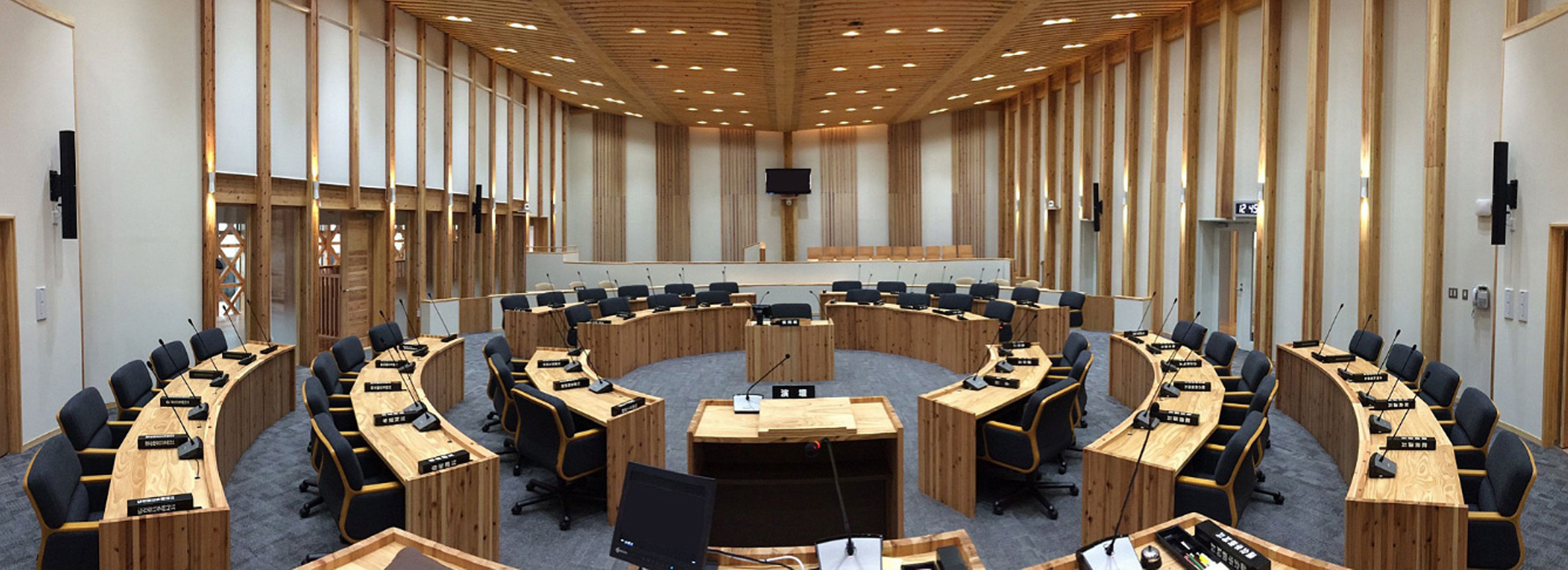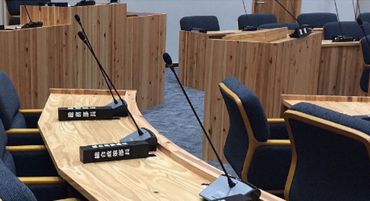 宮崎県小林市の市議会本会議場にオーディオテクニカ赤外線会議システムATCSシリーズが採用されました。マイクロホンと連動したカメラによる映像はインターネットで配信され、市民がリアルタイムに議事を視聴することができます。さらに「開かれた議会」実現のため、市民と行政側との距離感を無くすためにフラットな円形議場が採用されています。地場産の木材が多用された議場にはあたたかみの有る優しい雰囲気があふれており、住民の意思を反映させた議会運営に取り組む姿勢が強く感じられます。