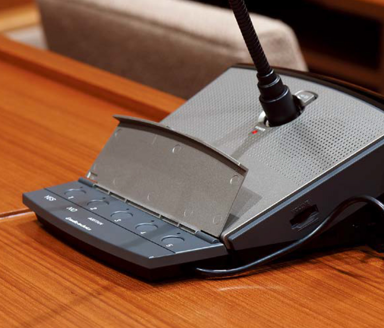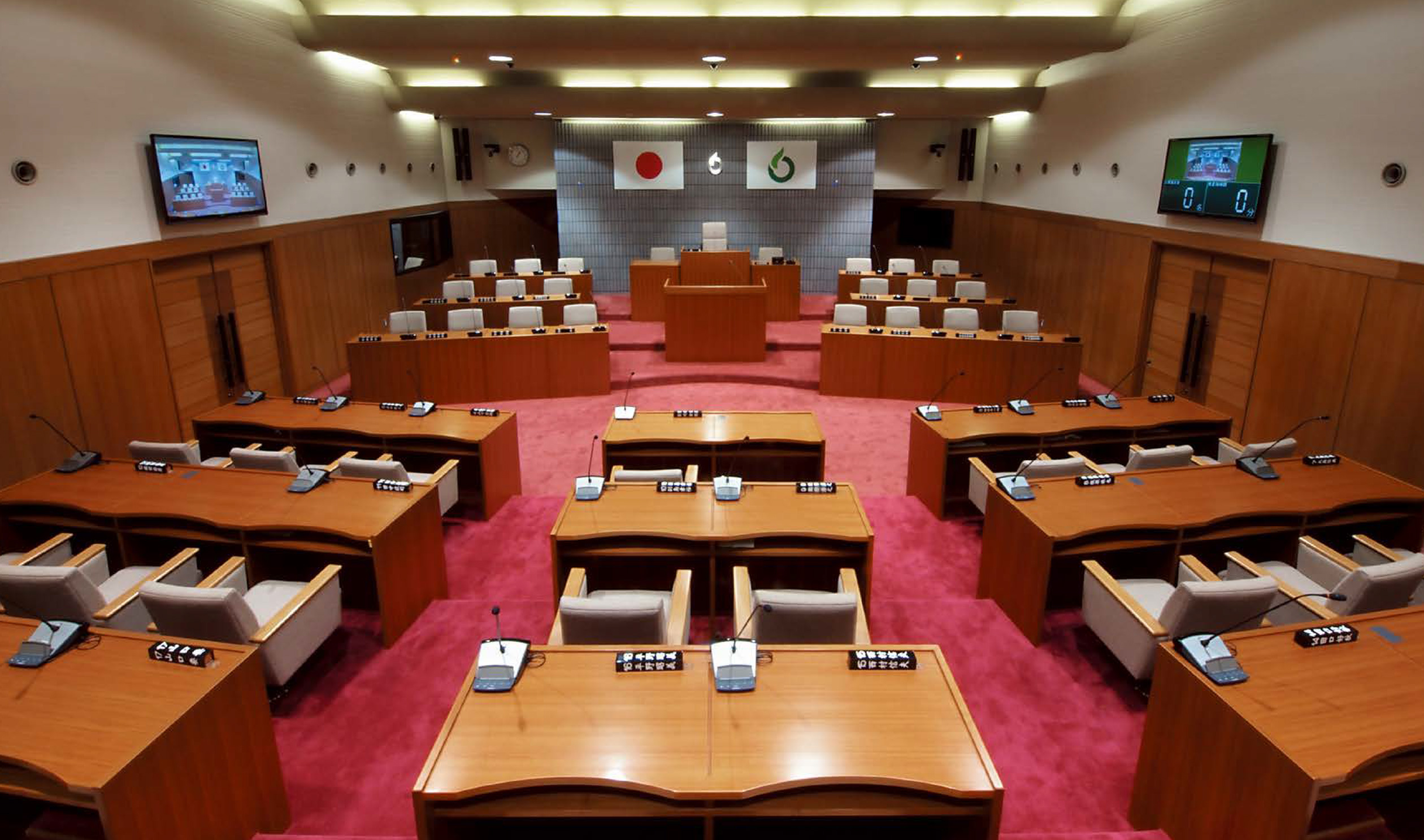 本会議場に42台の会議マイク導入、18台の投票機能も採用されています。AMXコントロールによりマイクの発言管理から発言に連動するハイビジョンカメラ映像+テロップ表示、採決・投票まで管理できるインテリジェント仕様。シンプルでありながら高性能、かつセキュリティも万全なシステムを構築しています。